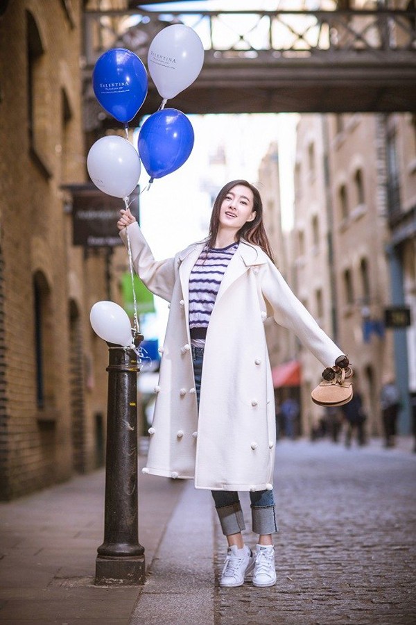 王丽坤手持蓝色气球漫步伦敦老街 回眸浅笑尽显恬静优雅